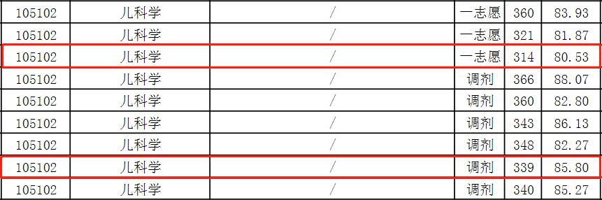 再来看一下皖南医学院 儿科学(105102)专硕的对比。复试线为309分,调剂最低录取分为339分,一志愿最低录取分为314分,分差也有25分。